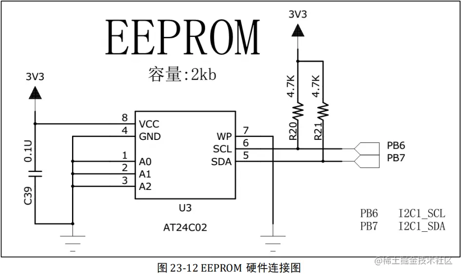 EEPROM 芯片中 WP 引脚具有写保护功能,当该引脚电平为高时,禁止写入数据,当引脚为低电平时,可写入数据,我们直接接地,不使用写保护功能。
