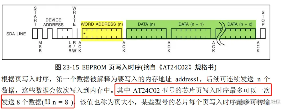 AT24C02 型号的芯片页写入时序最多可以一次 发送 8 个数据(即 n = 8 ),该值也称为页大小,某些型号的芯片每个页写入时序最多可传输 16 个数据。 - 第七个参数为操作超时时间。