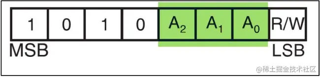1010,A2~A0为由管脚电平决定。AT24Cxx EEPROM Board模块中默认为接地。A2~A0 为 000,最后一位 R/W 表示读写操作。所以由于 I2C 通讯时常常是地址跟读写方向连在一起构成一个 8 位数,且当 R/W 位为 0 时,表示写方向,所以加上 7 位地址,其值为 0xA0,常称该值为 I2C 设备的“写地址”;当 R/W 位为 1 时,表示读方向,加上 7 位地址,其值为 0xA1,常称该值为“读地址”。