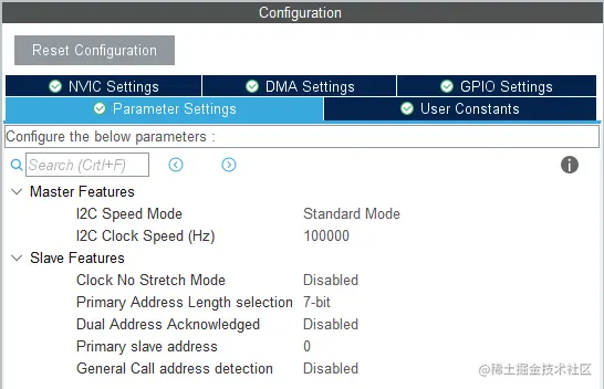 I2C 为默认设置不作修改。只需注意一下,I2C 为标准模式,I2C 传输速率 (I2C Clock Speed) 为