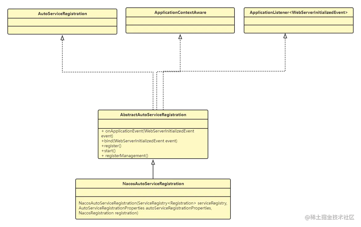 NacosAutoServiceRegistration 的父类AbstractAutoServiceRegistration监听了WebServer 初始化事件,当监听到web server 初始化事件时执行 bind(WebServerInitializedEvent event) 方法
