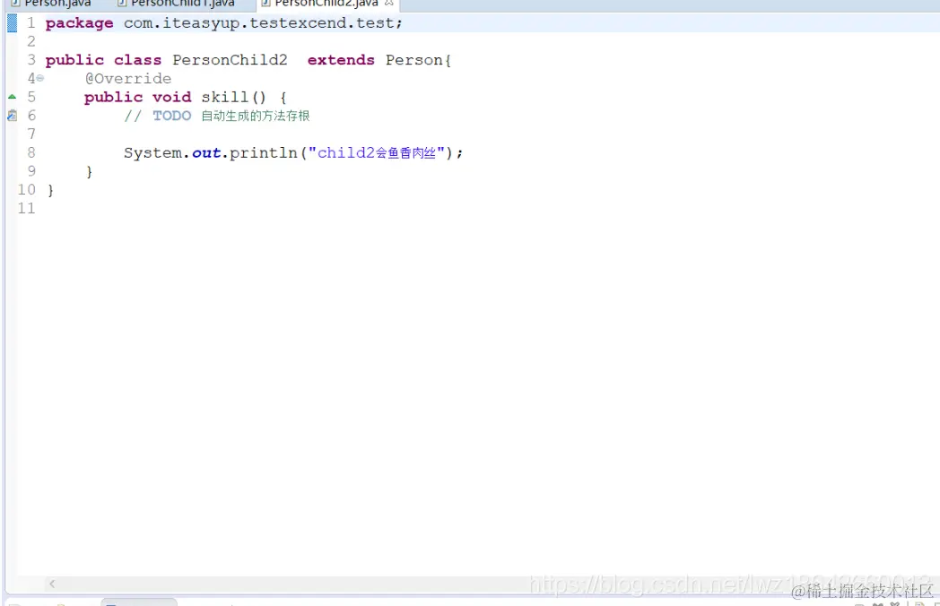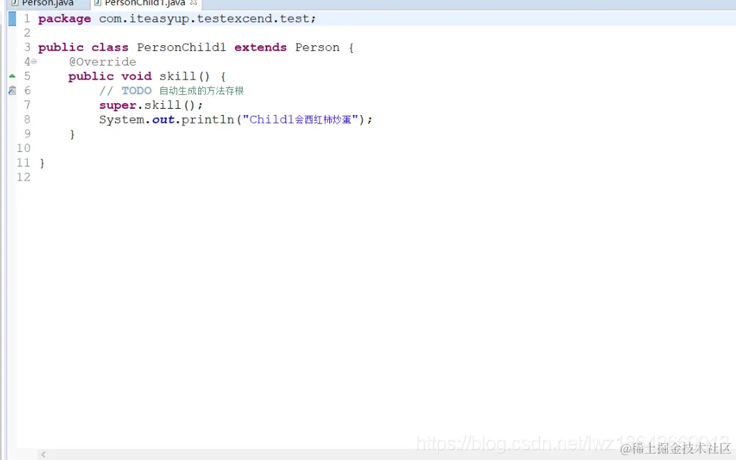 我们可以看到在第一个子类中,我们没有改变其原有结构,在下面添加了会西红柿炒蛋的打印语句,第二个子类中我们将super.skill(父类中方法)删掉,我们发现在调用对应的方法时,并没有打印出父类中的方法,也就是说,这个super代表的父类的对象(父类也称为超类),且删除后能够运行。所以当我们要完全重写父类方法时,可以将该句删除。