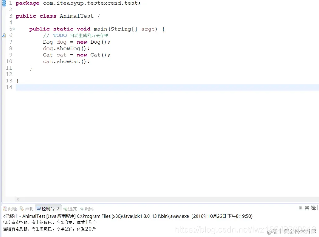 通过上述代码我们可以看到,cat类继承了animal类的属性(leg和tail),在测试中,我们直接调用cat类,成功获得了animal的属性并打印成功。