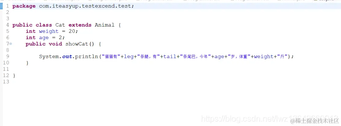 继承的关键字是 extend 也就是说在类名后接extend接父类类名。完成继承后我们可以得到父类的公共方法和属性(注意:私有的成员变量和方法是不能获得的),代码实例如下