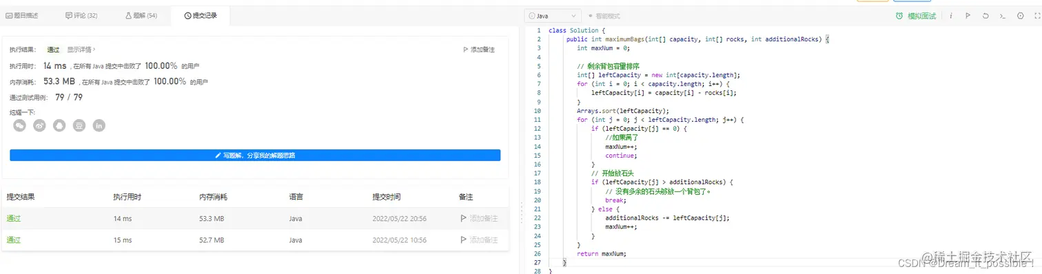 输入: capacity = [2,3,4,5], rocks = [1,2,4,4], additionalRocks = 2 输出: 3 解释: 1 块石头放入背包 0 ,1 块石头放入背包 1 。 每个背包中的石头总数是 [2,3,4,4] 。 背包 0 、背包 1 和 背包 2 都装满石头。 总计 3 个背包装满石头,所以返回 3 。 可以证明不存在超过 3 个背包装满石头的情况。 注意,可能存在其他放置石头的方案同样能够得到 3 这个结果。示例 2: