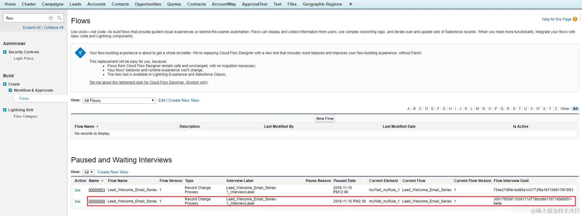 接下来我们把Process Builder创建好后可以创建一天符合条件的Lead,让Schedule进入执行队列,那么为了验证你的Process是否有执行可以在Flow里面查看,如下: