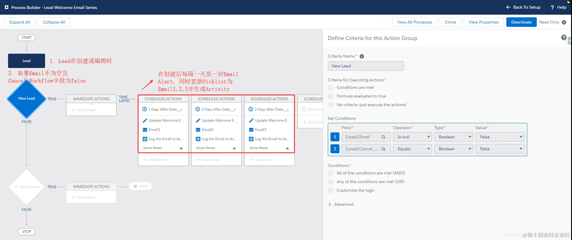 管理员很自然的为该业务创建了基于时间的Process Builder,即为Lead创建了一个Email系列的Process Builder,在创建后的1,2,3,4,5,6,7,9d执行Scheduled Action来发送不同内容的Email Alert。
