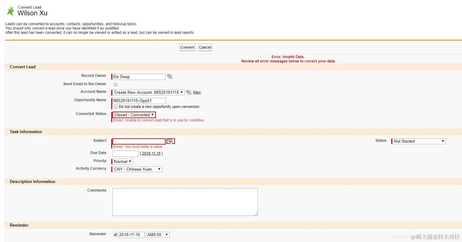 后面管理员发现,如果某条Lead在即将执行Action的队列里,那么在Covert线索时候就会报错,如下: