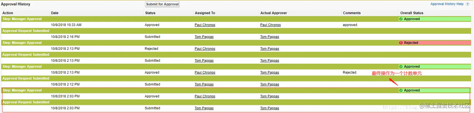 总结:这个是所有提交过的审批历史,可以理解为所有detail页面批准历史操作(pending/approved/rejected/Removed)的合集,见下图的单元片段: