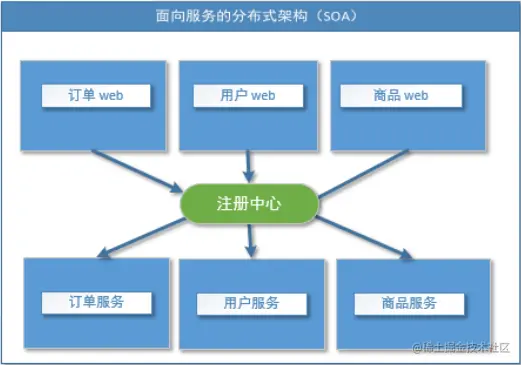当服务越来越多,容量的评估,小服务资源的浪费等问题,逐渐显现,此时需增加一个调度中心,基于访问压力,实时管理集群容量,提高集群利用率,此时,用于提高机器利用率的,资源调度和治理中心 (SOA)[ Service Oriented Architecture] 是关键;