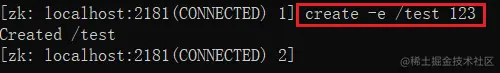 create -e /test 123:创建一个 test 节点,值为 123: -