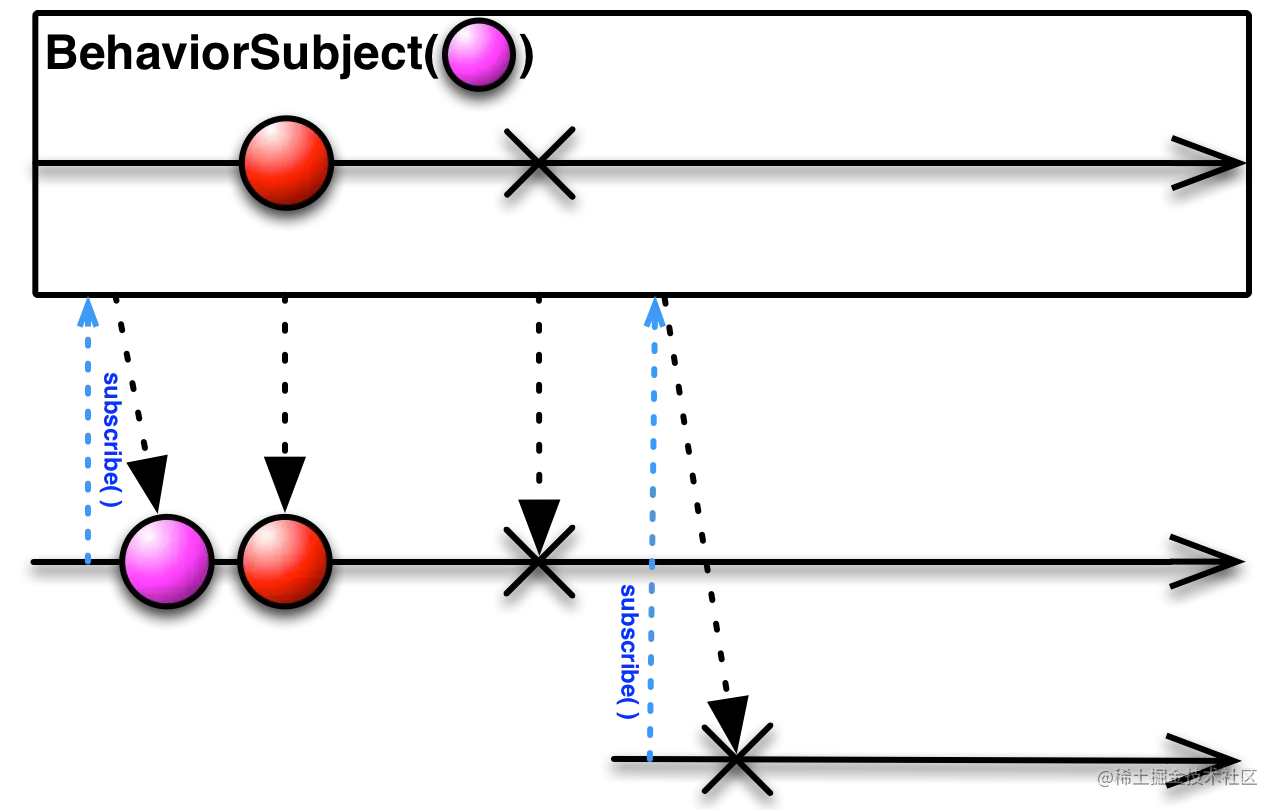 下面我们来简单了解下BehaviorSubject,官方给出的描述大致意思是它会发送订阅最近的上一个事件,如果没有的话,会直接使用给出的默认值,如下图所示