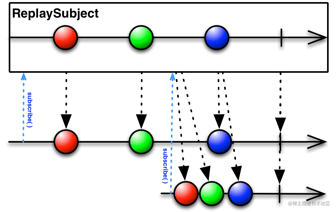 根据官方解释,ReplaySubject会发射所有事件数据给观察者,不管它什么时候订阅的,它都会缓存所有的发射数据,如下图所示