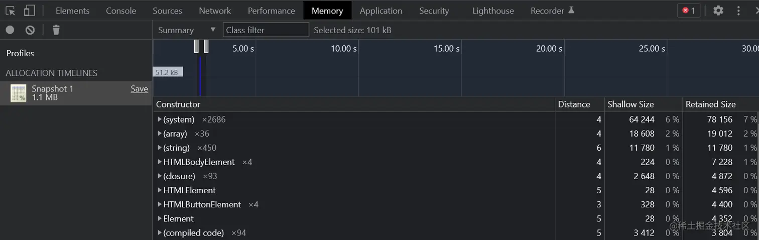 - heap snapshot记录了当前内存中所有对象占用内存的大小。
