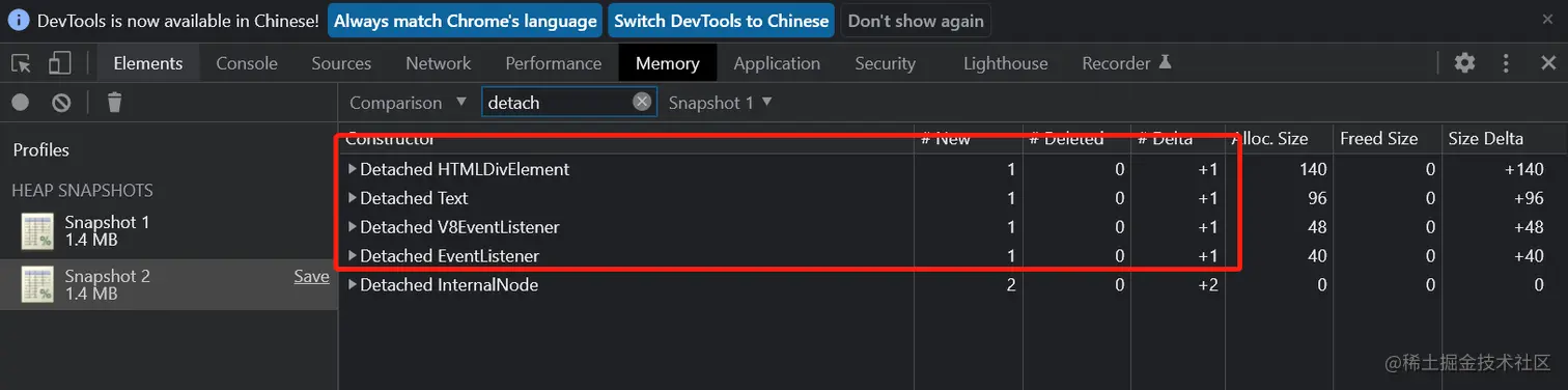 - 第四步,记录操作前后的heap snapshot,进行对比。观察到存在未释放的DOM节点和事件监听。