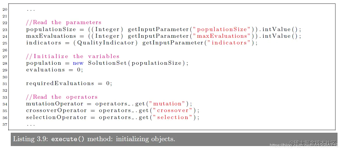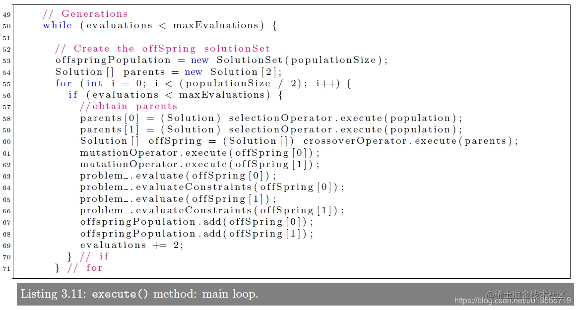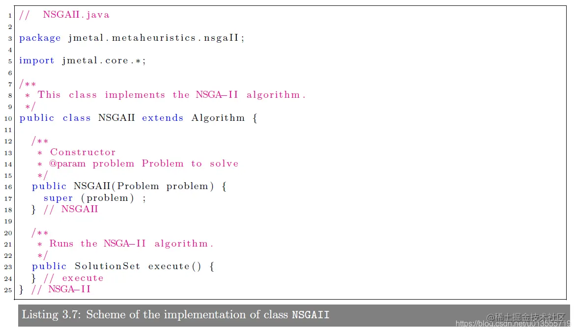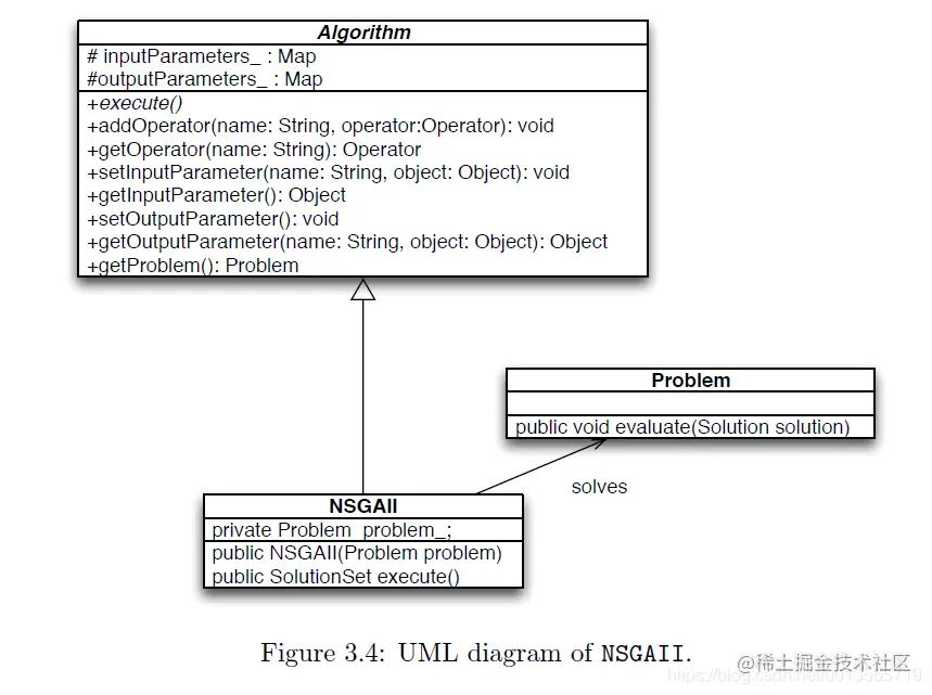 超参数,可以通setInputParameter()和 getInputParameter()进行设置和获取。也可以通过setOutputParemeters() and getOutputParameters()获取输出结果。在execute()函数中NSGAII有一个构造器constructor可以获取问题Problem并将其设置为一个参数parameter NSGA-II 在Jmetal中的实现可以在jmetal/metaheuristics/nsgaII/NSGAII.java中找到,代码结构如下