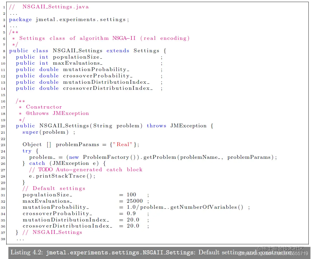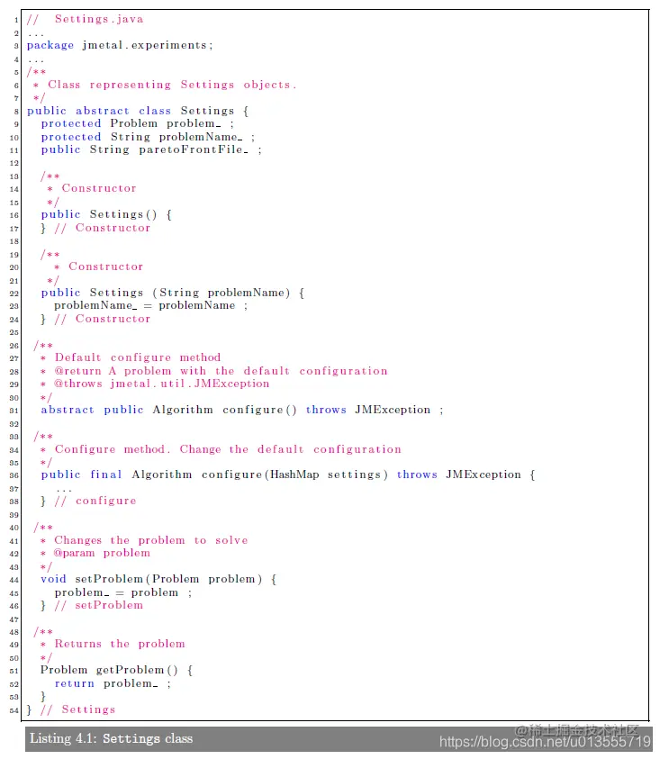 - 为解决此问题,我们采用了另一种方法来定义类中的元启发式方法的配置,该类将包含默认设置并允许对其进行修改。 清单4.1包含jmetal.experiment.Settings类的代码。 该类的主要特点是: