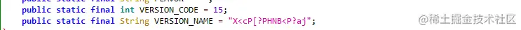 图中有两个关键的参数,即versionCode和versionName(源码中好像故意把值写反了),点击APPLICATION_ID到BuildConfig文件,得到这两个参数的值,如下图所示: