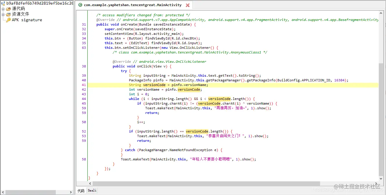 看来只有输入正确的值才能通过,也就是解出flag,这就要知道这些反馈的来源了,把apk扔进jadx-gui中反编译后,搜索那些提示语,找到MainActivity代码,如下图所示: