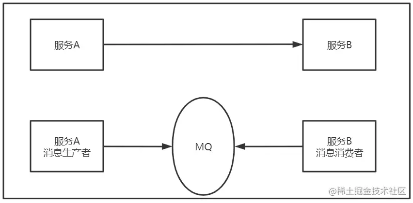 RabbitMQ是MQ中的一种,MQ(message queue)就是程序员口中常说的消息队列。它在服务与服务的调用过程中加了一层,将原本服务A调用服务B变成服务A将请求打到MQ,服务B自己去MQ拿请求处理(如下图) 。
