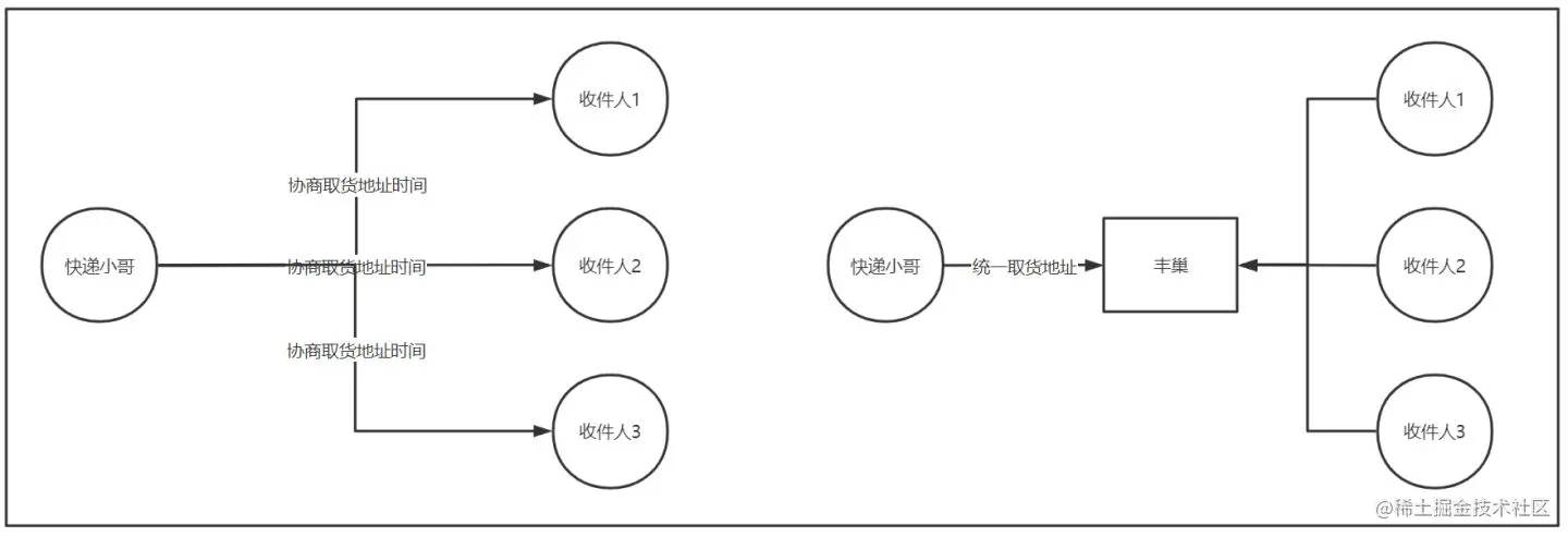 通过生活中的案例来描述mq的优缺点。其中快递小哥是服务A,丰巢就是MQ,收件人是服务B。下面我们假设快递小哥送快递是发送请求,收件人收到快递为响应完成。