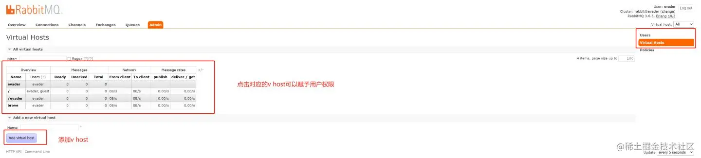 - virtual host:可以理解为MySQL中的数据库,想要操作需要赋予对应的权限,基于多租户与安全考虑的。一个broker可以创建多个v host
