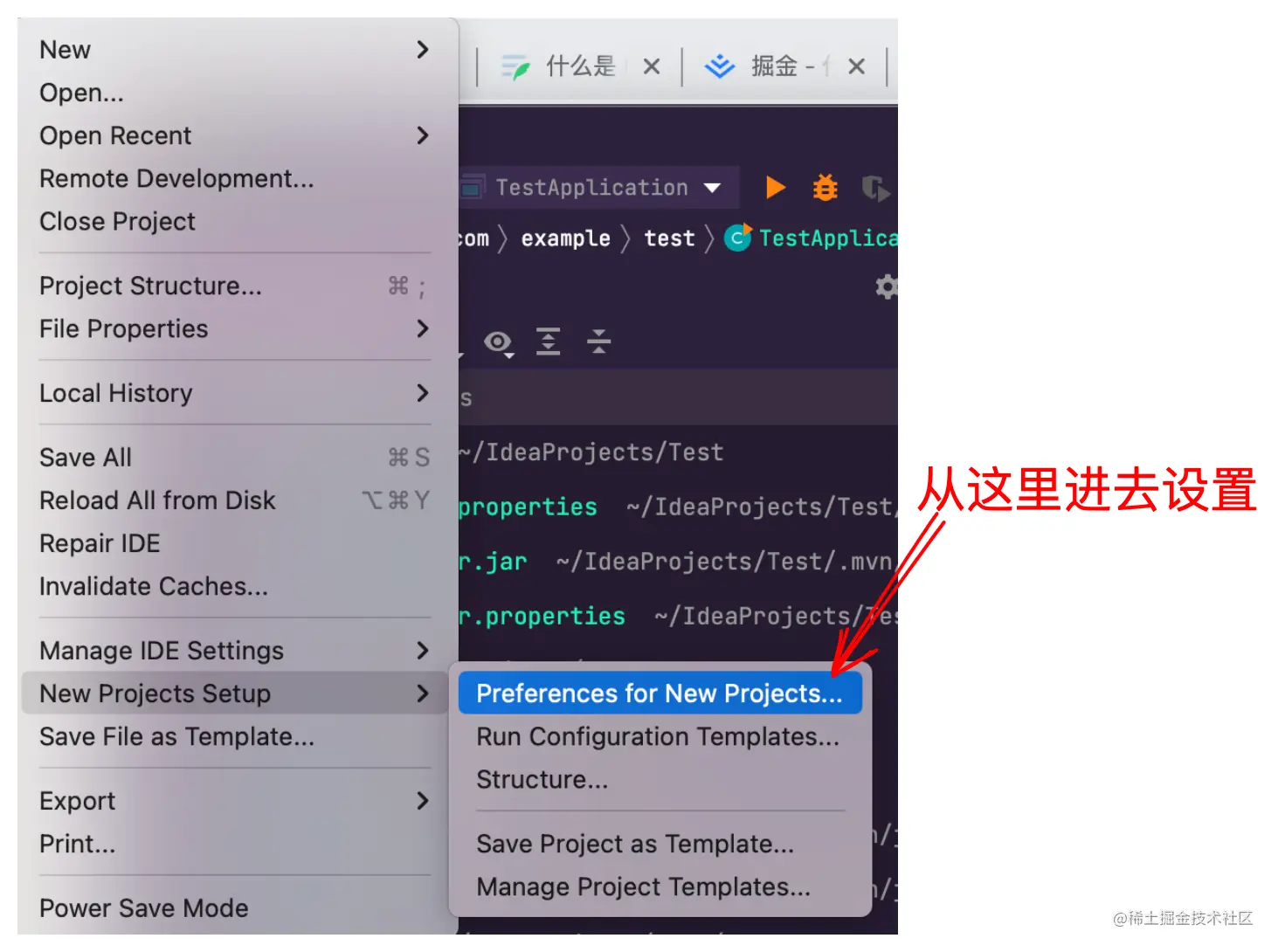 如上图所示,我们需要从菜单栏中的 File -> New Projects Setup -> Perferences for New Projects 为入口进入修改项目,这样进行修改了之后就对所有的项目都生效了。