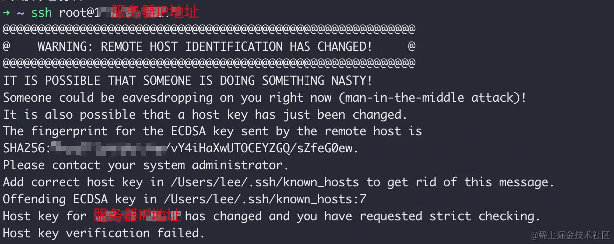 问题原因: 出现该问题是因为我将自己的服务器重制了,但是在之前我已远程连接过该服务器,在本地的.ssh/known_hosts生成了一个对应该服务器的唯一标识,而现在我仍然对这个ip地址进行连接,发现其标识不一样了就报错了。