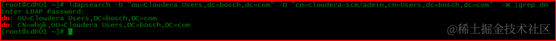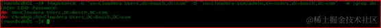 # ldapsearch -b "ou=Cloudera Users,dc=bosch,dc=com" -D "cn=cloudera-scm/admin,cn=Users,dc=bosch,dc=com" -W |grep dn