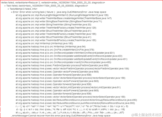 ORC是列式批处理文件格式,格式要求在写入文件之前将批次的行(batches of rows)缓存在内存中。在执行INSERT语句时,动态分区目前实现是:至少为每个动态分区目录打开一个文件写入器(file writer)。由于缓冲区是按分区维护,因此在运行时所需的内存量随着分区数量的增加而增加。所以会导致mappers或reducers的OOM,具体取决于打开的文件写入器(file writer)的数量。