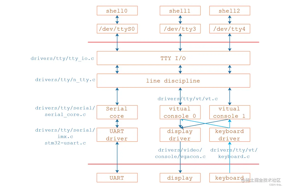 UART子系统(八)UART驱动情景分析_注册 daa 2022-05-23 188 阅读1分钟 UART驱动情景分析_注册 参考资料 参考代码: 硬件相关: drivers/tty/serial/imx.c drivers/tty/serial/stm32-usart.c 串口核心层: drivers/tty/serial/serial_core.c TTY层: drivers/tty/tty_io.c 1. 情景分析大纲 注册过程分析 open过程分析 read过程分析 write过程分析 2. 源码框架回顾 3. 注册过程分析