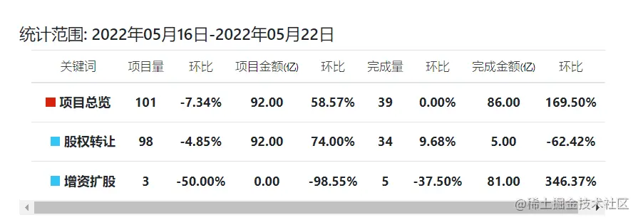 主要对项目总览、股权转让、增资扩股进行汇总,从项目量、项目金额、完成量、完成金额等维度出发,并做了环比计算。详情如下图: