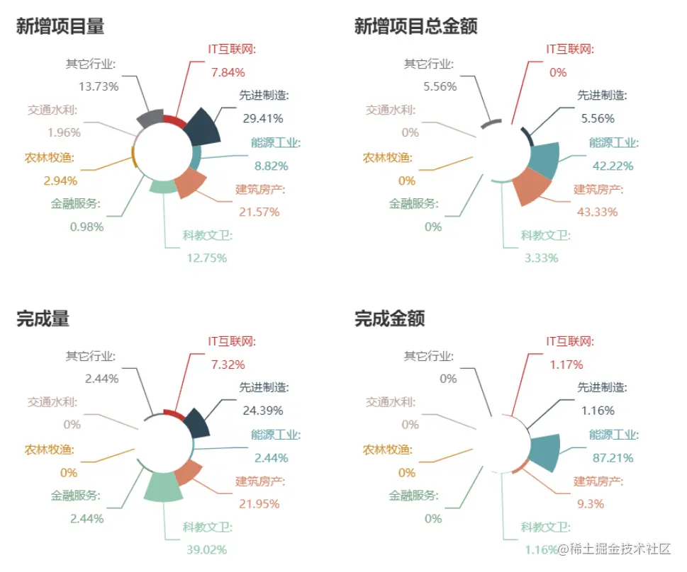 塔米周报按照行业对新增项目量、新增项目总金额、完成项目量、完成项目金额进行了统计并可视化展示。