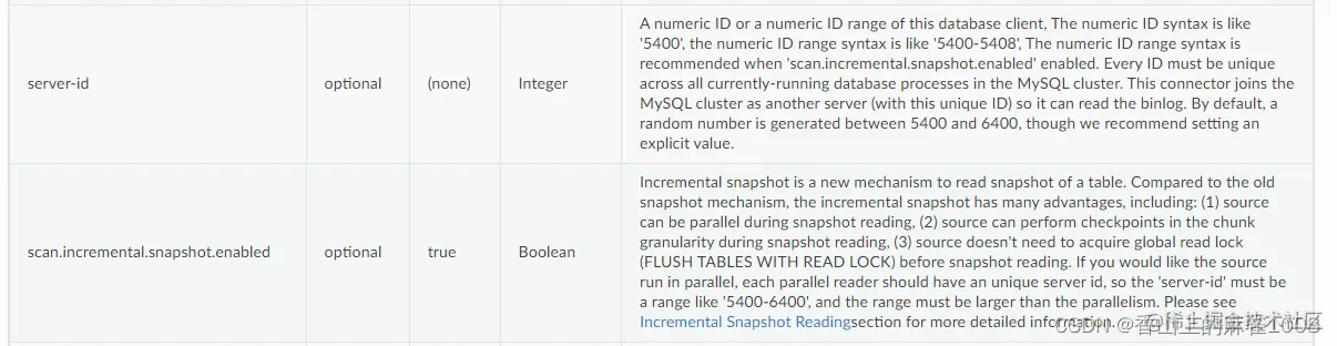 另外当 scan.incremental.snapshot.enabled 设置为true时(默认为true),则建议设置为范围,因为增量读取快照时,source是可以并行执行的,这些并行的客户端也必须有着唯一的server-id,增量读取快照的并行度由参数“parallelism.default”控制,而且server-id设置的范围必须要大于并行度。