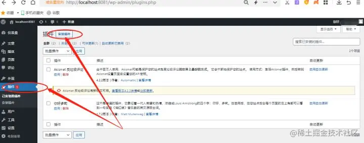 这样的网页明显不符合我们的要求,因此我们需要返回WordPress的仪表盘界面(在浏览器地址栏中输入http://localhost:8081/wp-admin/,即可回到WordPress仪表盘),在页面左侧的各项功能中,点击“外观”选项,并通过左上的“安装主题”按钮,选择自己喜欢的网站外观,就如同选择装修模板一样,对我们的网站进行外观重建。