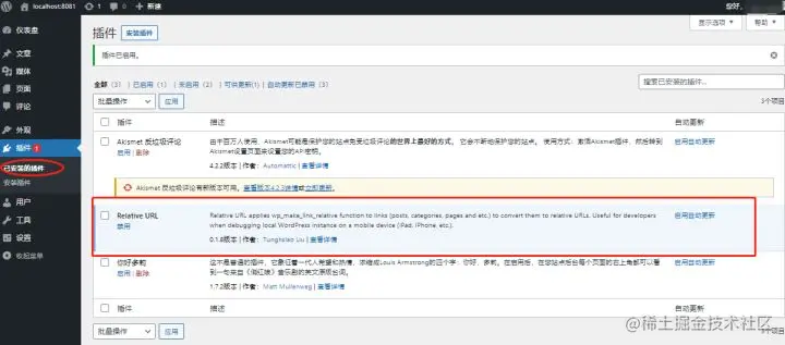 同样在WordPress的仪表盘界面左侧,我们找到“插件”选项,点击进入插件页面,点击左上角的“安装插件”按钮,在跳转页面的搜索框内输入URL插件名称(URL插件有很多种,如odt-relative-urls、relative-url、root-relative-urls等,这里我们选择relative-url这款插件),并在插件选择界面点击对应插件右上角的“立即安装”。在插件下载安装完成后,即可点击相同位置的“启用”按钮,让WordPress的插件生效。