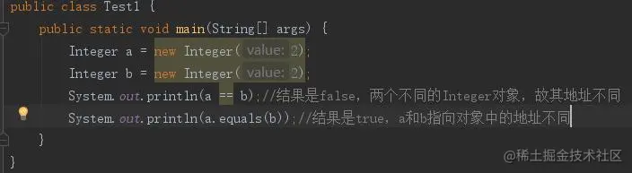 (2)对于基本类型的包装类型,比如Boolean、Character、Byte、Shot、Integer、Long、Float、Double等的引用变量,==是比较地址的,而equals是比较内容的。