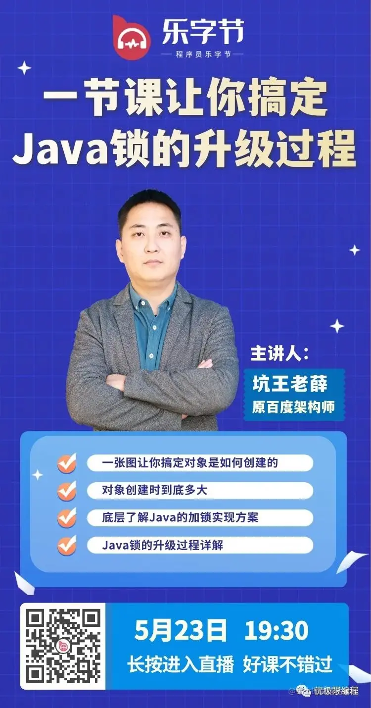 乐字节坑王老薛用一节课的时间,让你搞定Java锁的升级过程,今晚7点半,不容错过哟!