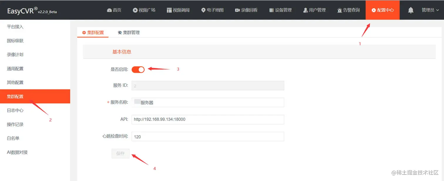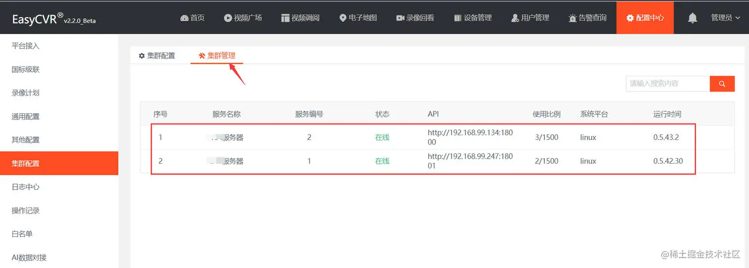 3)第三步:分别登录这几个EasyCVR平台,在配置中心—集群配置里打开集群开关,填写服务器名称、API信息以及心跳检查时间。这里需要注意的是:API信息就是页面登录的http://ip:port。填写完成后点击集群管理,就能看到参与集群的服务器了。
