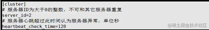 2)第二步:修改[cluster]的server_id的值,注意id不可重复。该字段用来标识服务器,只能在配置文件中修改。