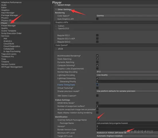 3、左边选中Player,打开Other Settings,勾选Override Default Package Name并重写包名,Minimun API Level选中19(sdk要求最低为19)。