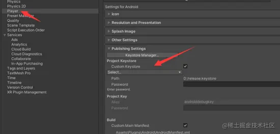 4、选中Player,打开Publishing Settings,设置签名。
