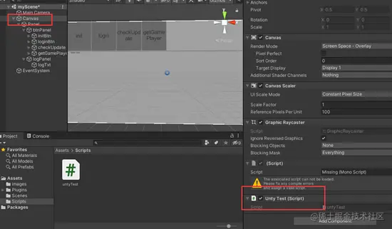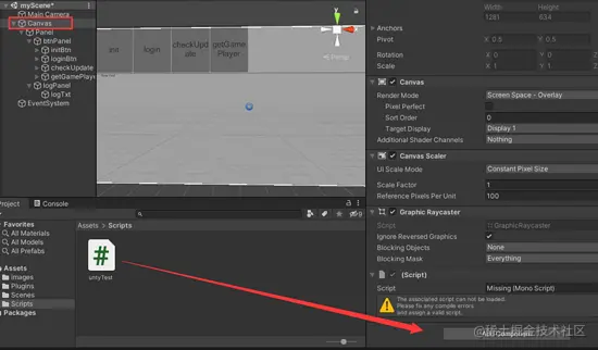 操作后可以看到脚本文件已挂载到画布Canvas上,如图: