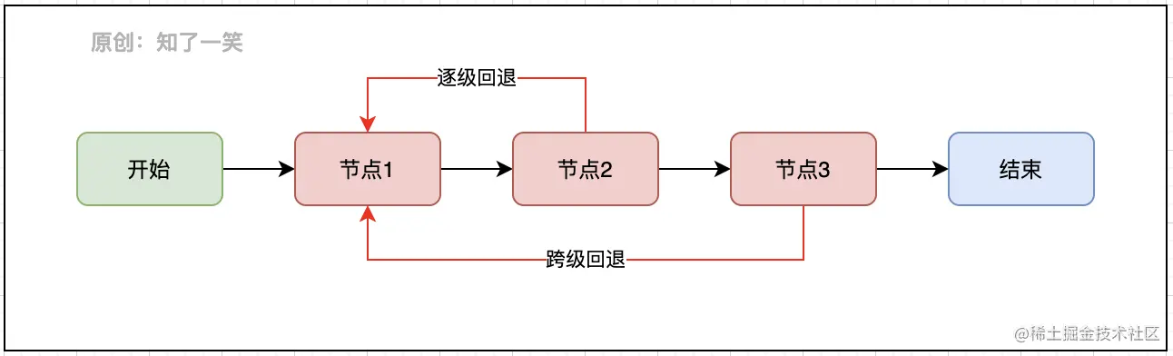 报表和表单从整体上看侧重模板化的封装,而审批类的业务则倾向流程的配置化,每个审批场景从开始到结束,完成需要经过多个节点,节点之间又存在递推或者回退的动作: