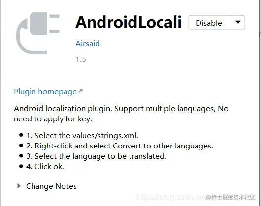 二.在AndroidStudio中安装一个插件,搜索“AndroidLocalize”,这个插件是用来翻译文本资源文件的,在string.xml文件上右键选择转换语言,选择想要的语言即可,之后就会自动生成不同语言的资源文件, 如图所示
