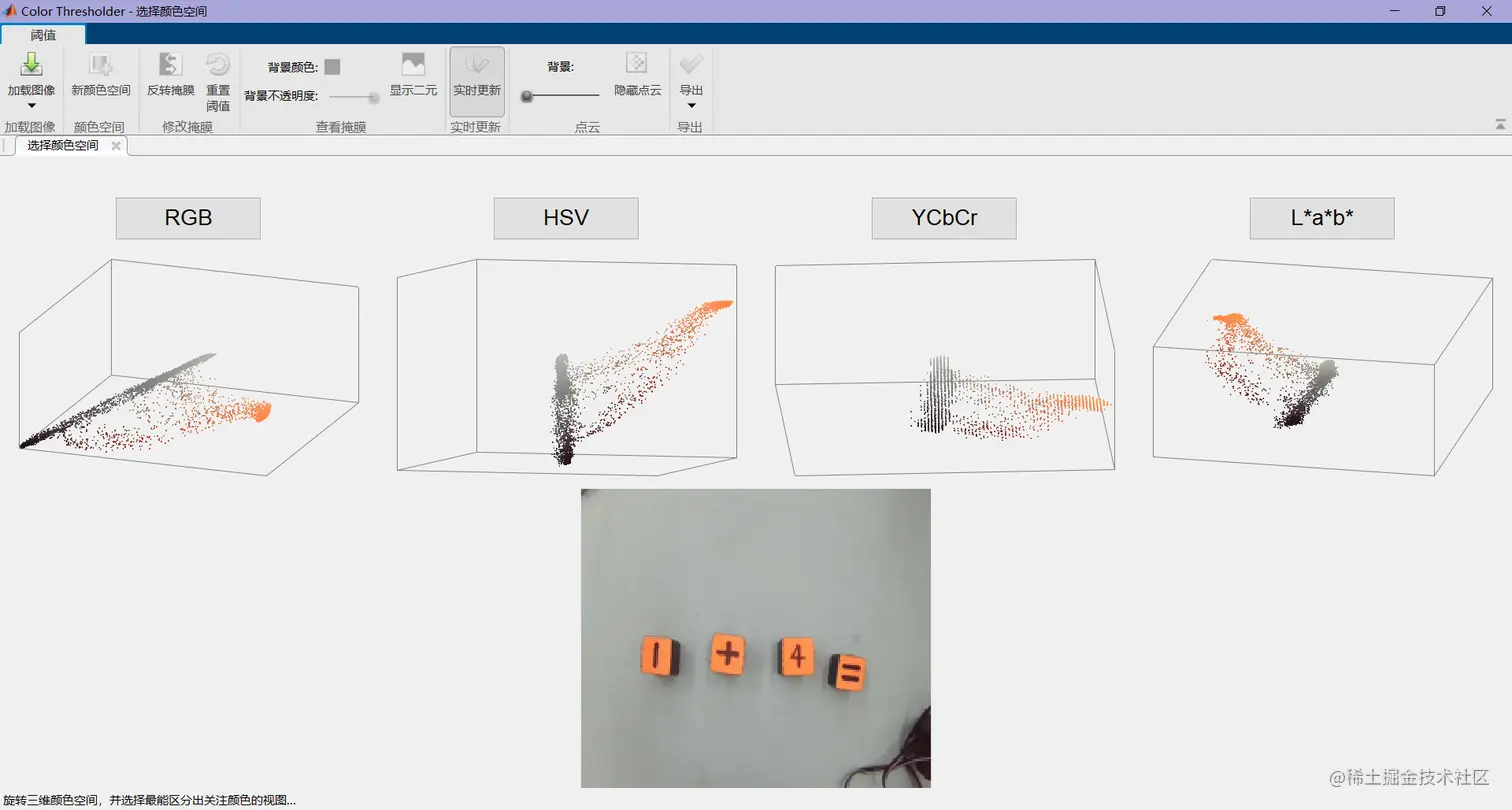 使用Matlab的Color Thresholder模块可以很方便的对图像进行不同颜色空间上的特征分析,如下图,可以看到图像的像素值在不同色彩空间下空间特征分布。观察空间特征分布,选取易于进行空间平面分割的色彩空间,这里选择RGB色彩空间进行分割,如下图。