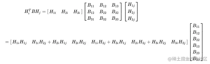 只要求解出向量 b ,即可得到矩阵 B 。每张标定板图片可以提供一个vb=0 的约束关系,该约束关系含有两个约束方程。但是,向量 b 有6个未知元素。因此,单张图片提供的两个约束方程是不足以解出来向量 b。因此,我们只要取3张标定板照片,得到3个b的约束关系,即6个方程,即可求解向量 b。当标定板图片的个数大于3时(事实上一般需要15到20张标定板图片),可采用最小二乘拟合最佳的向量 b ,并得到矩阵B。