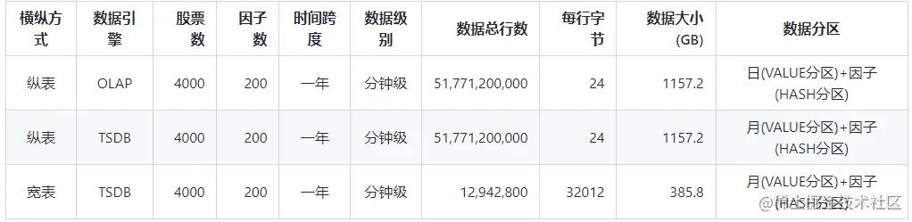 - 以纵表存储,使用TSDB引擎,每行按时间存储一只股票一个因子数据,分区方案 VALUE(月)+ HASH(因子名,50), 按股票代码+时间排序。