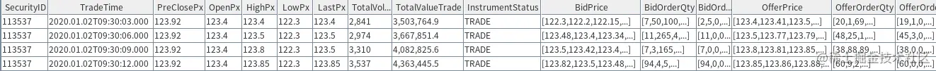 股票交易所每3秒发布一次,每次涵盖这3秒结束时的日内累计成交量(TotalVolumeTrade),日内累计成交金额(TotalValueTrade),3秒终了时的盘口买卖双方挂单(买方为 Bid,卖方在有些数据源字段为 Offer,在有些数据源字段为 Ask,其余字段以此类推:BidPrice 为买方各档价格,OfferPrice 为卖方各档价格,OrderQty 为买卖双方各档的委托单总量, Orders 为买卖双方委托单数),3秒终了时的最近一笔成交价格(LastPx),全天开盘价(OpenPx),日内截止当下最高价(HighPx),日内截止当下最低价(LowPx)等各字段。其他和逐笔成交一致的字段不再赘述,涵义一致,详情可参见交易所数据说明字典。