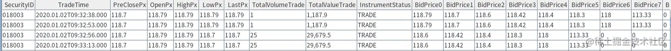 包含每只股票,每分钟的开盘价、最高价、最低价、收盘价,四个价格字段,同时记录本分钟的成交量和成交金额。另外,数据 K 线可以依据基本字段计算衍生字段,比如:k 线均价(vwap 价格)。k 线数据是由逐笔成交数据聚合产生,具体代码可以参考第三章3.3.4基于快照数据的分钟聚合。